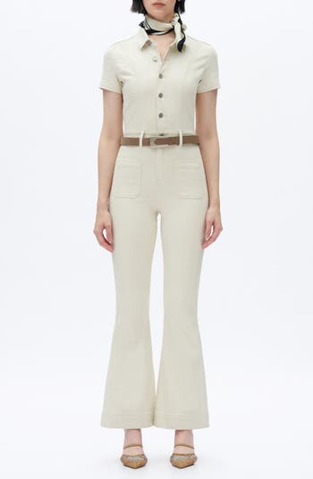 Subtle fading enhances the lived-in appeal of this essential denim jumpsuit fashioned with short sleeves and flared legs.