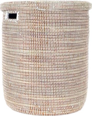 This minimalist Black Basket with a flat lid adds a touch of handmade global decor to any room. A perfect storage container, it has both practical functionality and a minimalist, contemporary look that would look at home in practically any space. Use it as a hamper for towels in the bathroom, to store throw pillows in the living room or bedroom, or even in your entryway for scarves, etc - its uses are endless! It also looks great with the other size black basket as a focal point in any room. Wolof women in rural Senegal weave these baskets from millet grass, and black plastic threads which add strength and durability.