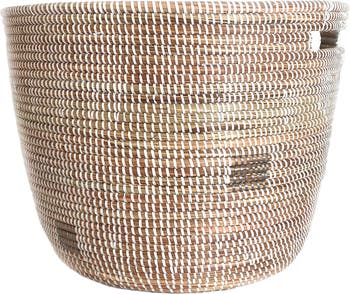 This minimalist Patterned Low Storage Basket with a flat lid adds a touch of handmade global decor to any room. A perfect storage container, it has both practical functionality and a minimalist, contemporary look that would look at home practically in any space. Use it as a hamper for towels in the bathroom, to store throw pillows in the living room or bedroom, or even in your entryway for scarves, etc - its uses are endless! It also looks great with the other black baskets as a focal point in any room. Wolof women in rural Senegal weave these baskets from millet grass, and black plastic threads which add strength and durability.