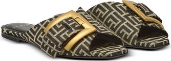 Flat monogram jacquard Anthem sandals\nOpen elongated square toe\nStrap with PB-engraved gold metal buckle\nLeather outsole, insole and lining\nHeel height: 1.5 cm\nMain material: 63% polyester 37% cotton\nMade in Italy\nItem: GN1UP158TJBM