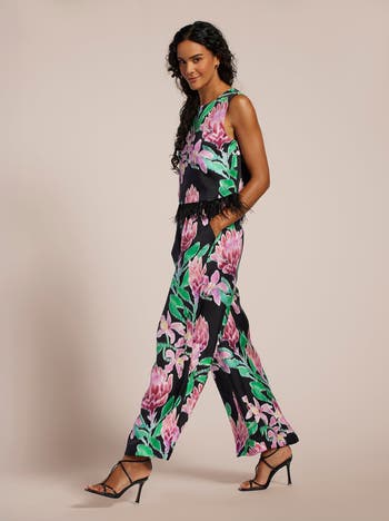 Orchids and protea bloom on a hazy island evening. Along the garden path strolls a chic Parisian traveler, snapping photos of the display. Vacation style should feel effortless. The Emi Pant features a wide leg silhouette and easy pull-on styling. Front pleats add a smooth, tailored finish. Woven in a wrinkle-resistant linen-viscose blend. 100% Mulberry silk Wide leg Front pleats Elasticized back waist Size small inseam: 31" Dry clean only.