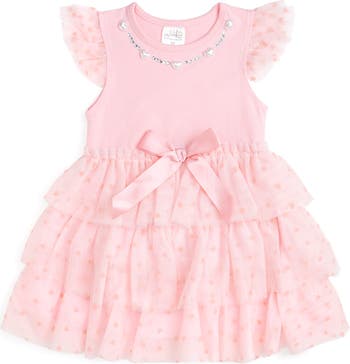This pink tiered tutu dress sparkles with heart and gem necklace details and layers of ruffled tulle sprinkled with tiny hearts — perfect for twirls, tea parties, and all her happiest days.