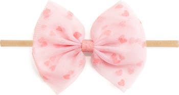 This pink tulle baby headband topped with a flocked heart bow is the sweetest finishing touch for your little Valentine!