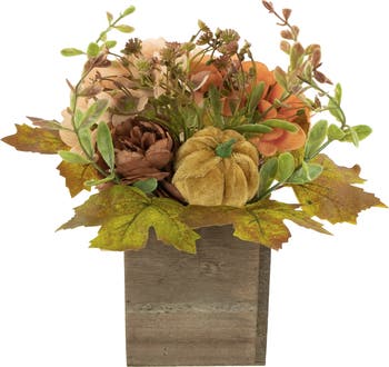 This fall harvest arrangement would be the perfect addition to your Thanksgiving decor. With realistic, earth-tone pumpkins and flowers, it will add a touch of nature to your home or office. Perfect to place on tabletops and mantles. Features: Fall harvest orange pumpkin floral box Accented with green and brown foliage Comes in a distressed taupe box Perfect to place on any tabletop in your home Recommended for indoor use only Dimensions: 10" high x 8" wide Wooden box: 4.75"H x 4"W x 4"D Material(s): plastic/wood/foam/polyester
