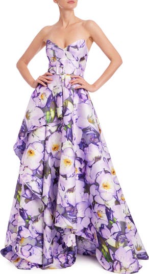 Cascading fabric panels and a strapless bodice fitted with sculpted, petal-like cups make captivating focal points for this belted ballgown patterned in a lavish lilac garden. This season, the New York design duo channels the storied glamour of fashionable First Lady Jackie O with vibrant flora that nod to the Mediterranean travels of her second husband s famed yacht, Christina O.