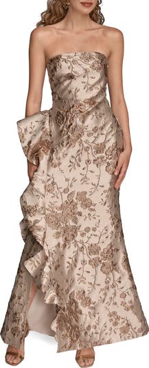 Drama, fluidity and movement shape a scene-stealing gown cut from metallic jacquard with pleats, a sculptural ruffle and movement-easing slit.