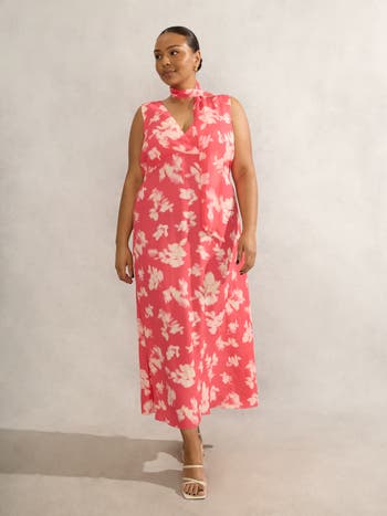 Cut from an 100% viscose fabric this Coral Floral Midi Dress is a must have for your summer wardrobe. With the additional neck scarf this dress looks so flattering on and one you ll want to wear time and time again. It has a flattering V-neckline and the fixed wrap design looks so gorgeous. The sleeveless silhouette is perfect for the warmer months and will see you through the summer in style. The partially elasticated waist allows for comfort and a fitted feel without any restrictions.