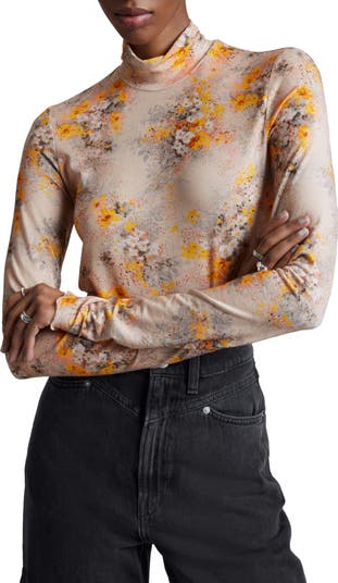 A vintage-look floral print sweetens a curve-hugging mock-neck top made from soft, stretch-enhanced lyocell.
