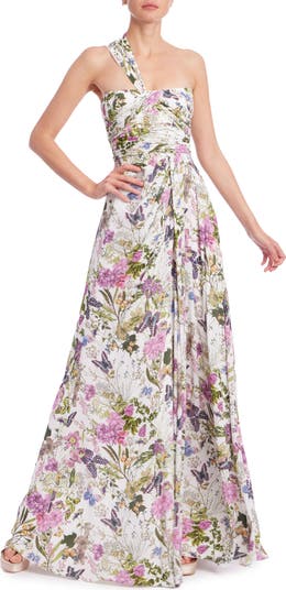 The garden blooms with you in this enchanting A-line gown designed with a gathered bodice and asymmetric neck.