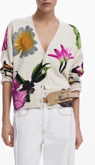 Vibrant florals bloom across this cozy knit cardigan that adds a bright vibe to any look you pair with it.