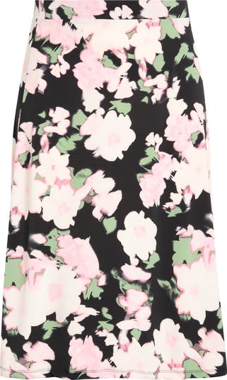 A blurred-brushstroke floral print elegantly illustrates this subtly flared knit skirt featuring pull-on ease and all-day comfort.