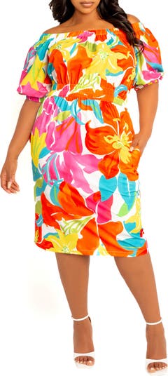 Dainty bows trim the back of this sweet shoulder-baring dress designed in a vibrant bloom print and framed by charming puff sleeves.