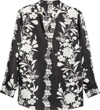 A flowery print romances this polished split-neck top cut from rich skin-skimming satin.