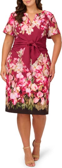 Bouquets of painterly blooms romance this figure-skimming sheath framed by abbreviated sleeves and centered with a defining tie belt.