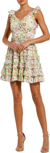 Floral ruffle mini dress with flutter straps, V-neckline and tiered skirt. Feminine, lightweight and perfect for brunch, vacations, showers and garden parties.