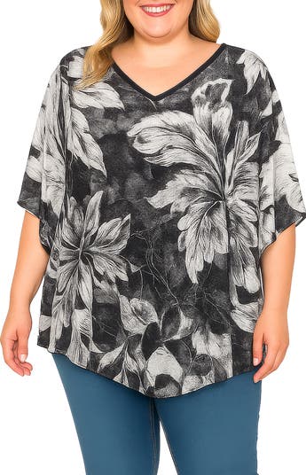 An allover black-and-white floral pattern sketched at statement scale makes this breezy top with kimono-style sleeves a versatile new wardrobe piece.