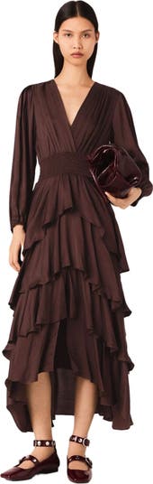 Cascading ruffles and satin-effect fabric for a flowing, structured silhouette. This maxi dress plays on the contrast between a subtle sheen and ruffled details, true to the Maje DNA. The cross-over neckline defines the top perfectly, while the smocked waist and supple sleeves ensure a comfortable and elegant fit. The front slit and asymmetrical hem accentuate the movement.Wear with jewelled ballet flats for a light and confident look.