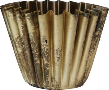 - A dramatic and striking planter that features a fluted metal surface with a brass finish and a distressed look