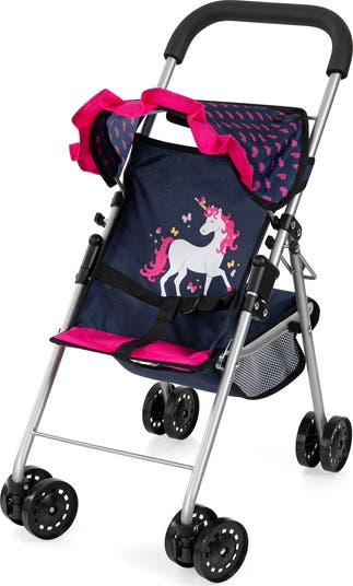 BAYER DESIGN DOLLS: STROLLER - BLUE-PINK-HEARTS-UNICORN - This wonderful blue and pink doll’s umbrella stroller is suitable for dolls up to 18 inches (46 cm). With its beautiful design and easy maneuverability, thanks to its double wheels and swiveling front wheels, this stroller ensures smooth and effortless driving, allowing your child to take their beloved companions for a stroll with ease. The sun canopy provides essential protection, shielding the doll s face from the sun s rays during outdoor adventures. Plus, with the integrated belt, your child can rest assured that their doll will stay securely in place, preventing any accidents or mishaps. But that s not all – the integrated basket offers ample storage space for taking along additional toys, adding to the fun of playtime outings. And when it s time to head home or tidy up, the stroller can be easily folded for convenient transport or storage. More than just a toy, this fashionable stroller encourages nurturing and role-playing skills in your child, fostering empathy and creativity. Whether it s caring for their dolls or going on imaginative adventures, this stroller is sure to become a cherished favorite in your child s collection. Give the gift of endless fun and learning with the Doll’s Umbrella Stroller – the perfect accessory for nurturing play and imaginative exploration.