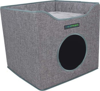 JESPET GOOPAWS: FOLDABLE CAT CONDO - Provide your kitty with a place to lay and play with the JesPet Foldable Cat Condo! This GOOPAWS 15.5 x 15.5 x 15.0 cube easily fits in any room without taking up too much space. It’s lightweight, sturdy and designed with a padded platform and a hideout area. Its crafted using wood panels, a durable linenette fabric for the exterior and a felt interior to accommodate those sharp claws. Every cat condo also comes with a reversible cushion for added comfort during the warmer and cooler months. Summer; breathable fabric cloth. Winter: Sponge and flannel fabrics. And since it’s completely foldable, it’s easy to move and store! Stable Construction: Lightweight and sturdy construction supports pet sorts of activity, places to sleep, padded platform, reversible cushion in two design options on lower level: hand wash. Perfect for indoor use! Measures: 15.5 x 15.5 x 15". With a 7.5 inch opening.