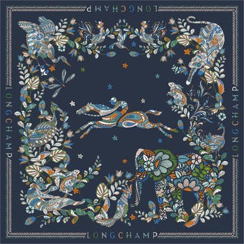 Give your look a distinctly French accent with the fine silk and whimsical forest pattern of this large square scarf.