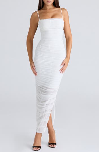 Richly ruched and slashed with a side slit, this ethereal maxi dress is fitted with a bustier-inspired bodice and powermesh lining.