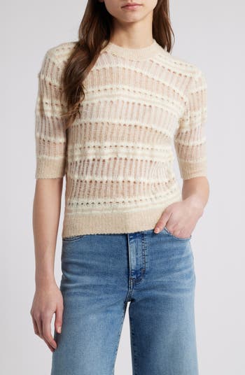 A mix of four soft, slightly fuzzy yarns brings to life the eclectic medley of stitches that create the rich depth and tactile dimension of this crewneck sweater.