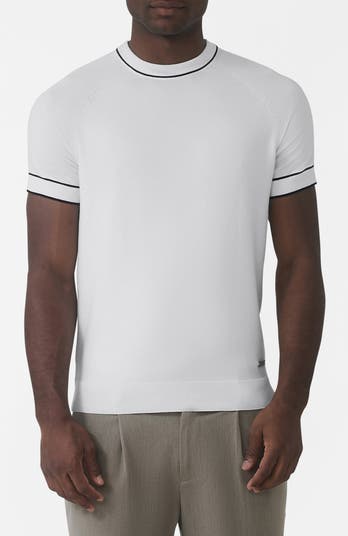 The Franco Luxury Cotton Crew Neck Knit Tee combines style and comfort. Raglan sleeves and a slim fit enhance your physique, while soft cotton knit ensures all-day ease. Striking contrast tipping and a silver plaque at the hem give a distinctive finish that sets it apart.