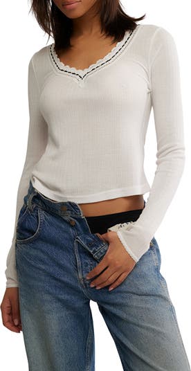 Ribbon lace trim highlights the V-neckline of this long-sleeve pajama top made from a semisheer cotton-rich rib.