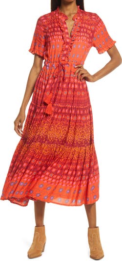 This full-skirted maxi is patterned in a microfloral print, condensed to form stripes around the skirt and sleeves, while ruffles and pleats add to the charm.