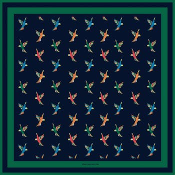 Description"Freedom Wings" is inspired by the vivid energy of parrots in flight, capturing the beauty of movement and the spirit of liberation. A lively array of multicolored wings dances across a deep navy background, creating a dynamic rhythm that feels both playful and powerful. The repeating composition celebrates nature’s vitality while offering refined artistic elegance. Finished with meticulously hand-rolled edges and presented in a high-end package, this scarf is a stunning piece to treasure or to gift.Product Details:100% mulberry silk21"W x 21"LDouble-sided with the same colorsHand-rolled edges with hand stitching finishingLovingly packaged in a beautiful JZ presentation box * Because the edges are crafted by hand, there can be minor differences in the measurements.Care:Fill a sink with cold water and mild detergent.Submerge scarf and swish for a minute.Rinse with cold water and press gently to remove excess water.Lay on towel, roll to remove remaining water.Hang or lay flat to air-dry away from sunlight and heat.Professional dry clean is recommended.How To Wear A 25-Inch Square Silk Scarf:Classic Knot: Fold the scarf in half diagonally to form a triangle. Drape it around your neck with the point of the triangle facing down. Cross the ends behind your neck, then bring them to the front and tie a simple knot.Neck Wrap: Fold the scarf in half diagonally to create a triangle. Place the middle of the folded edge at the front of your neck, and then wrap the ends around your neck, bringing them to the front again. Tie a knot or let the ends hang loose.Bandana Style: Fold the scarf into a smaller square or a rectangle. Place it at the back of your neck and tie the corners at the front. This style works well as a headband too.Hair Accessory: Fold the scarf into a thin strip and tie it around your ponytail or bun. You can also use it as a headband, securing it with a knot or a bow.Handbag Accent: Tie the scarf around the handle of your handbag for a chic and stylish accent.Bracelet or Anklet: Fold the scarf into a thin strip and tie it around your wrist or ankle for a unique accessory.Remember, silk scarves are versatile and can be customized to suit your personal style. Feel free to experiment and find the look that best complements your outfit and mood!