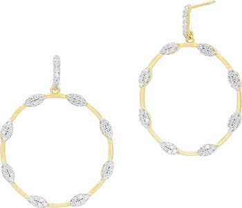 Cubic zirconia clusters are stationed around a pair of elegant drop earrings plated in high-shine 14-karat gold.