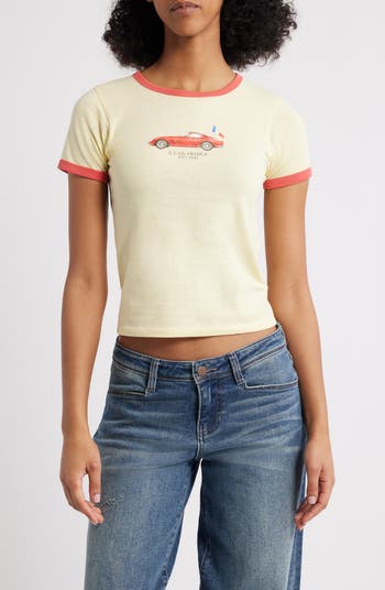 Add French flair to your ensemble with this ribbed baby tee featuring a retro car graphic and sporty ringer trim.