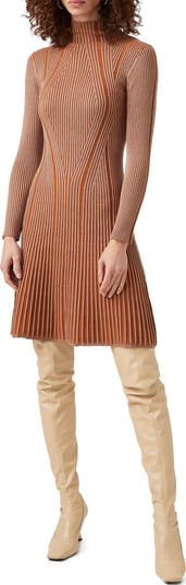 Allover ribbing brings textural interest to this shapely high-neck dress finished with a flared stem-showing skirt.