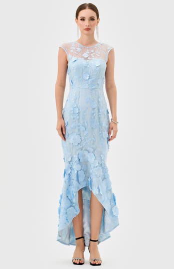This gown features an illusion high neckline with sheer cap sleeves, offering a delicate contrast to the fitted bodice and tapered waistline. Cut to a high-low asymmetric hem, the skirt showcases dimension and movement while highlighting the floral appliqué throughout. Fully lined and finished with an invisible back zip for a seamless fit.