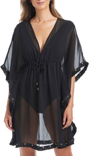 Lounge poolside feeling breezy and confident in this sheer cover-up caftan outlined in fringey trim.