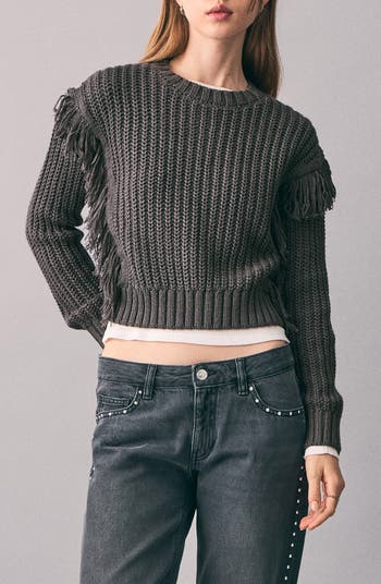 Fringe trim down the sides adds a fun textural twist to this cozy ribbed sweater.