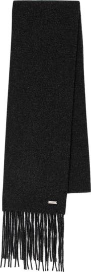 Wool scarf adorned with long fringes at both ends and a metal plaque with engraved logo.