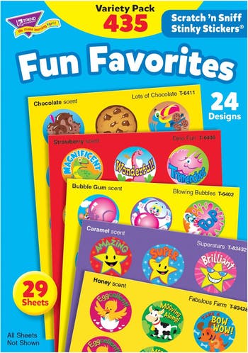 Scratch ’em and sniff ’em for a burst of fragrance! Everyone s favorite stickers, Stinky Stickers® are fun to collect or use to motivate and reward. Designs include Superstars, Bubbles, Furry Friends®, School Time, Peppermints, Dino Fun, Chocolate, and Farm. Designs may vary. Acid-free, nontoxic, and safe for use on photos. 24 designs, 435 stickers, 8 scents.
