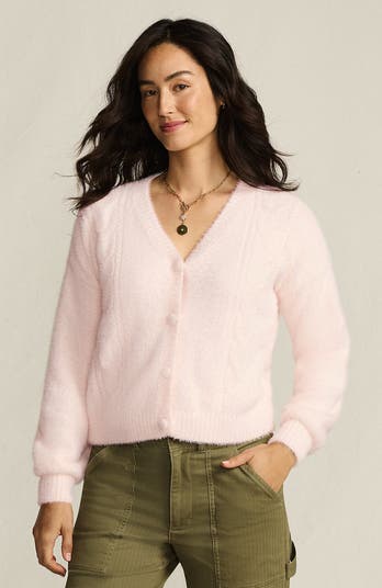 Wrap yourself in the dreamy texture of the fuzzy eyelash cable cardigan. With its delicate cable knit design and feathery-soft eyelash yarn, this sweater brings a touch of whimsy to your cold-weather wardrobe. The V-neckline and four button closure adds an elegant silhouette, perfect for layering or wearing on its own for a relaxed, romantic look.