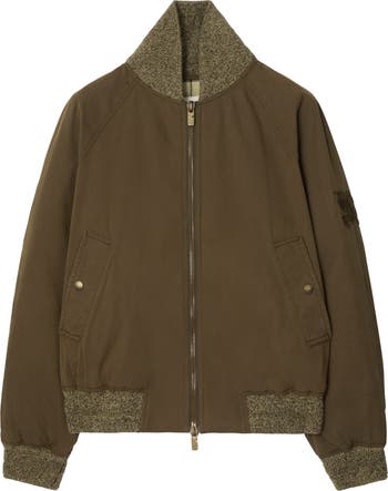 A bomber jacket in cotton nylon gabardine, washed and brushed for a super-soft finish. The style is edged with tonal rib-knit trims in a wool-cashmere blend and embroidered with our Equestrian Knight Design. Cut to a relaxed fit and filled with goose down and feathers for added protection on cooler days.||Two-way zip closure|Side press-stud welt pockets|Rib-knit trims|Burberry Check lining|Embroidered Equestrian Knight Design at sleeve|Comes with a garment bag