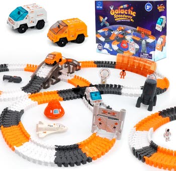 Space Race Car Tracks Set for Kids: Build your own race car track designs with this space themed buildable race car track set for kids. This complete 250-piece flexible race track set includes 225 snap-together tracks, 2 LED race car toys (batteries not included), tunnels, bridge, gate, intersection, space ships, astronauts, and space accessories! Flexible Tracks, Endless Designs: Bend, twist, and loop the flexible race car tracks into unique shapes and speedways. Kids can build straight tracks, slopes, tunnels, and intersections for nonstop fun. Multiplayer STEM Building Game: A hands-on learning toy that sparks creativity, problem solving, and motor skills as kids design and construct their own race car track layouts. Easy to Use and Store Race Tracks: Snap-together tracks are quick to set up and roll up easily for travel and storage. Durable, non-toxic materials make this race track building toy safe and fun for kids ages 3+. Complete Race Car Playset: Set includes 225 race track pieces, 2 light up toy cars (requires 2 AA batteries, not included), 4 ships, 2 astronauts, 6 clear tunnels, slope bridge, gate, and intersection for immersive space play. Perfect Gift For Kids: A creative STEM toy and exciting race track set in one! Engage kids for hours with this brain challenging and equally entertaining STEM building toys race track set for kids!