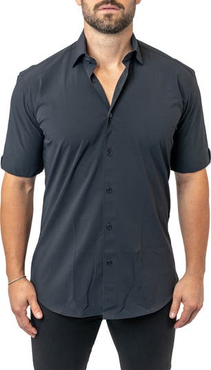 Stretchy, sweat-wicking fabric that resists odors and wrinkles keeps you looking and feeling fresh all day in a shirt styled in a versatile hue.
