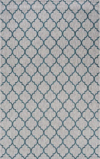 Inspired by the tile floors of Morocco, this indoor/outdoor rug adds elegant pattern to your porch, patio or sunroom. The ogee-curved trellis woven in navy adds graphic punch to a beige background. Mingled threads give this pattern a handwoven, vintage vibe that s perfect for an entry, kitchen, hallway, living room or bedroom too. The pet-friendly and kid-proof flatweave design makes it easy to clean, and perfect for the beach house.