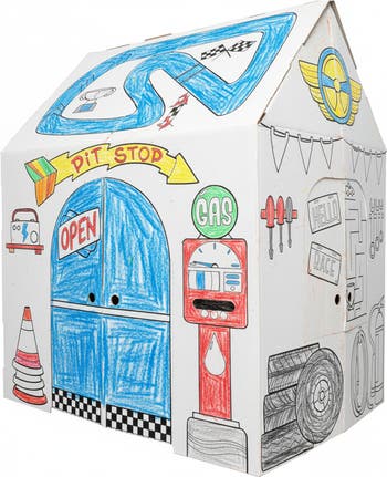 This is the garage playhouse kids dream of! Take a pit stop and change a tire, gas up, take a race around the track and fix anything with every tool you need. With plenty of areas to customize and personalize, they will make it their own. Kids can decorate the house (inside and out! ) with markers, crayons, colored pencils, paint, stickers and more.