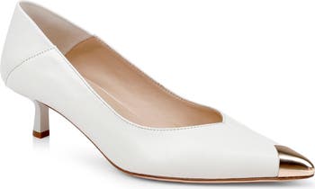 A metallic toe cap adds visual intrigue to a glossy leather pump grounded by a cushioned footbed and of-the-moment kitten heel.