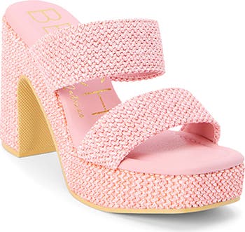 Wavy raffia textures this boosted sandal from the wide top straps to the chunky block heel and platform.