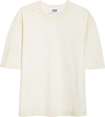 Opposing aesthetics fuse to eye-catching effect in this faded, distressed cotton T-shirt glitzed up with light-catching rhinestones and Golden Goose s signature spliced-star hardware at the nape.
