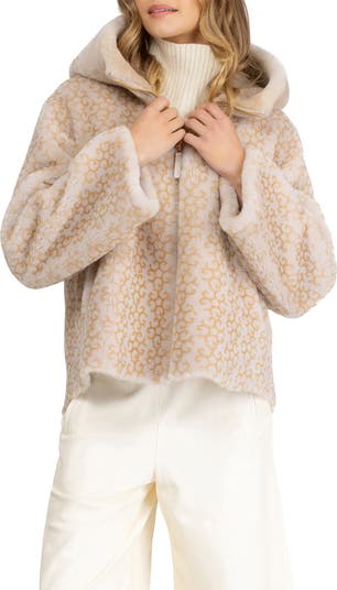 The Reversible Genuine Shearling Insignia Jacket with Hood combines bold style and cozy comfort. Featuring a distinctive insignia pattern on one side and gold shearling Genuine Shearling on the other.