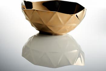 The middle of the 20th Century signified an explosion of ideas and new thinking. The aesthetic engendered by that time resulted in a sensibility that still reads as vibrant and daring today. The MOD ICONS COLLECTION channels that style. The bold geometric design of the handsome GEO bowl makes it a one of a kind addition to your decor and a unique piece to keep on display on its own or filled with fresh fruit on the kitchen island. Each of our creations is designed in our San Francisco studio. Master craftsmen using centuries old technique of sand casting create the original mould and skilled artisans hand create every piece, with pride, in our family owned factory. |Dimensions : 5.75" H; 14.5" L; 10.5" W |Finish : Gold |Material : Aluminum |Use and Care Given its handmade and hand-finished nature, variations in the piece are to be expected and celebrated. No two pieces are exactly alike.